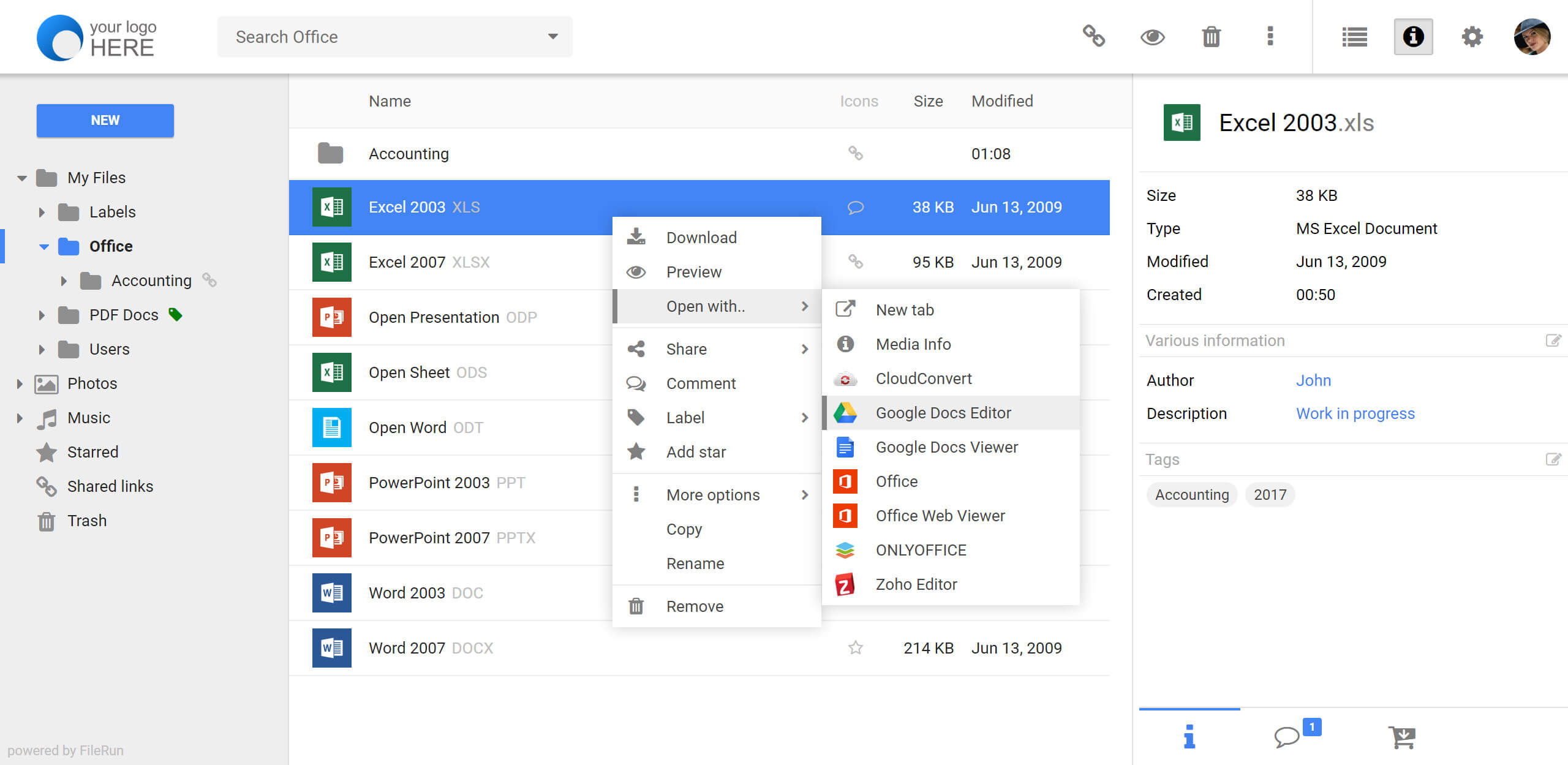 Files Run是一款基于PHP写成的文件管理器。界面精美,支持众多插件,比如Google Doc,Microsoft Office,Google Drive,AutoDesk等。可以自由部署在任何一台装有PHP运行环境的VPS上。